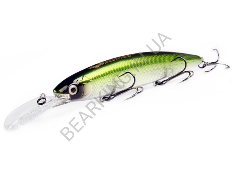 Bearking Balisong Longbill 130SF цвет F Green Back прекрасно работает весь сезон открытой воды и ловит хищную рыбу там, где японская приманка бы и не побывала из-за боязни получить мертвый зацеп.